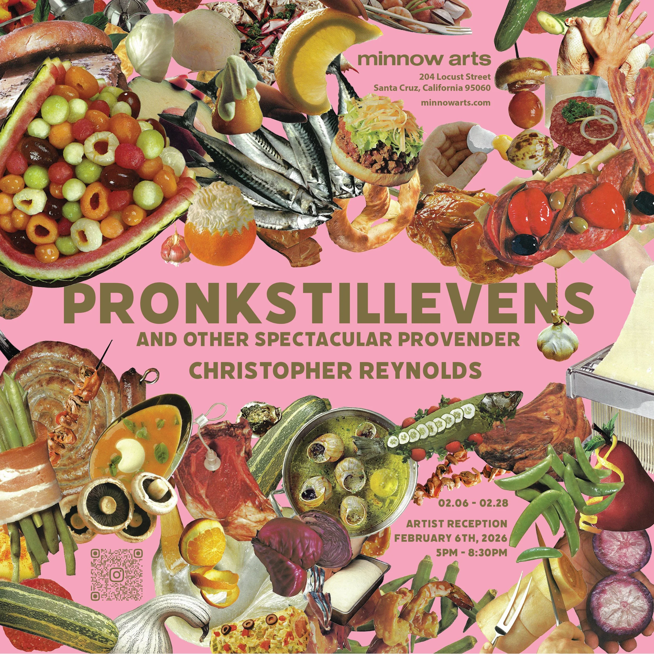 Pronkstillevens and Other Spectacular Provender at Minnow Arts presents new collage works, paintings, and sculptures by Christopher Reynolds that examine food as both image and instrument. Drawing from the visual language of Dutch still life paintings, mid-century food photography, and contemporary consumption culture, the exhibition stages food as something excessive, seductive, and politicized. Across media, Reynolds reconfigures familiar forms of abundance and display along with physiological and psychological manipulation, inviting viewers to consider how appetite and taste shape desire, identity, and power.